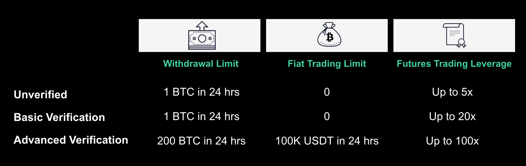 - Неверифицированный. Основной момент – с какой суммы ограничен лимит ежедневного списания — 1BTC в день. Такие аккаунты не могу участвовать в торговле с использованием фиатных токенов. Установлена верхняя планка предоставления максимального маржинального плеча фьючерсной торговли – до 5х.
