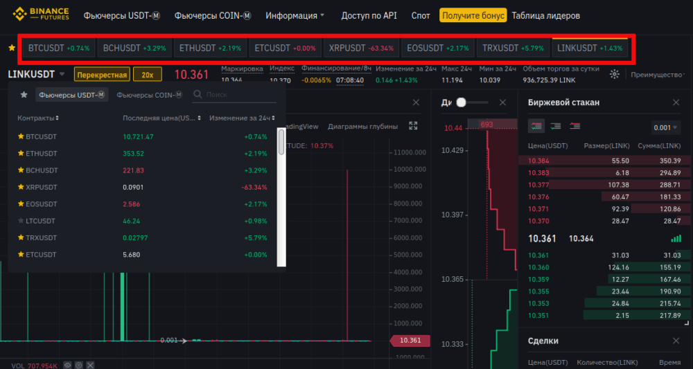 Binance предлагает более 50 фьючерсных пар типа криптовалюта — USDT. Наиболее востребованные для конкретного игрока контракты можно выносить на панель быстрого доступа над ценовым графиком. Каждый актив отличают свои собственные паттерны поведения графика, фундаментальные основы изменения курса и другие важные особенности. Осваивать их все в режиме реальной работы — все равно, что платить за обучение стороннему человеку. В данном случае смысла в этом нет, потому что подобные знания можно получить с демо торговлей.