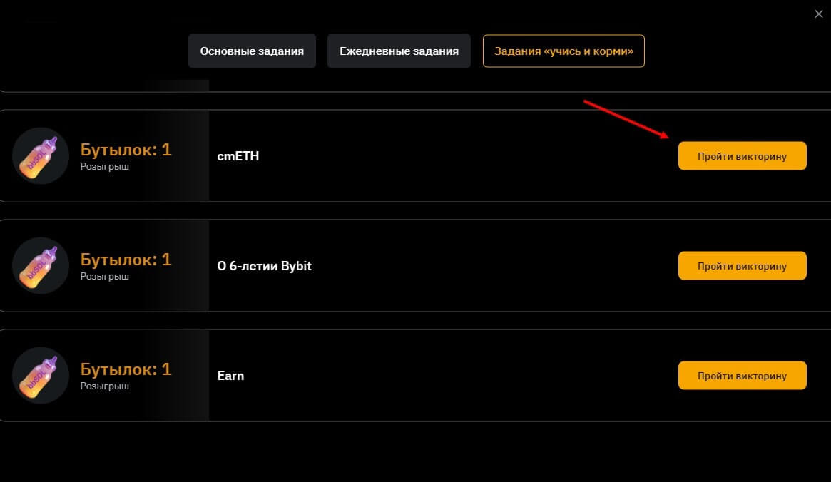 - Задания “учись и корми”. Это своеобразная викторина, позволяющая получить по 1 бутылочки. Всего на сайте 6 викторин, тем самым пользователь может за 15 – 20 минут получить первые 6 бутылок для прокачки своего персонажа. Чтобы начать выполнять, необходимо кликнуть на кнопку “пройти викторину”.