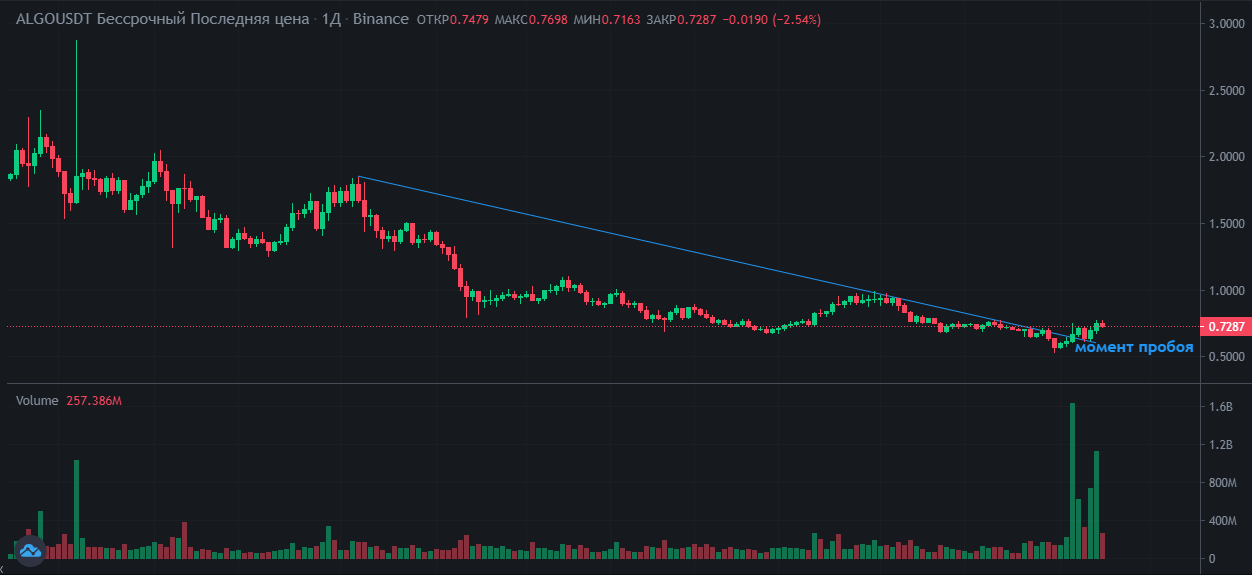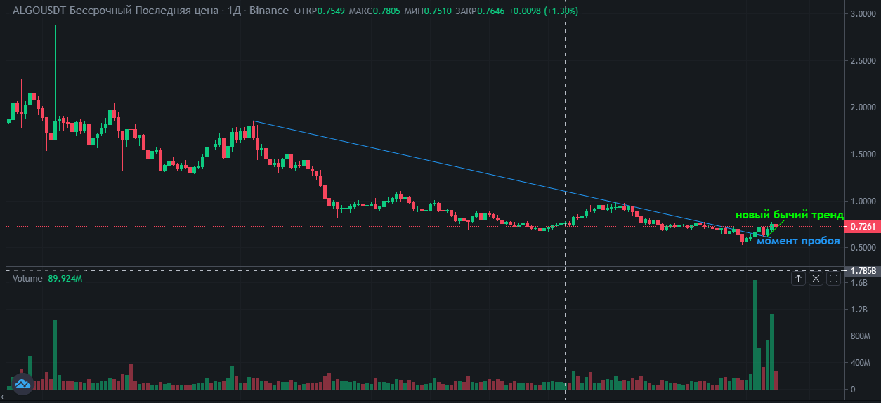 Главный плюс, как торговать стратегии на растущем рынке – их относительная простота. В этой ситуации выражение «купил дешевле – продал дороже» как нельзя лучше описывает ситуацию с глобальной точки зрения. Вне зависимости от используемого инструментария, биржевому игроку достаточно найти такую точку входа, при которой дальнейшее развитие будет происходить в сторону открытой позиции. Одним из часто используемых, простых, но надежных приемов идентификации перехода к движению вверх является пробой трендовой линии. Ниже показан пример такой ситуации на графике ALGO/USDT в торговом терминале Binance, при падении курса Биткоина эта пара демонстрировала противоположный тренд.