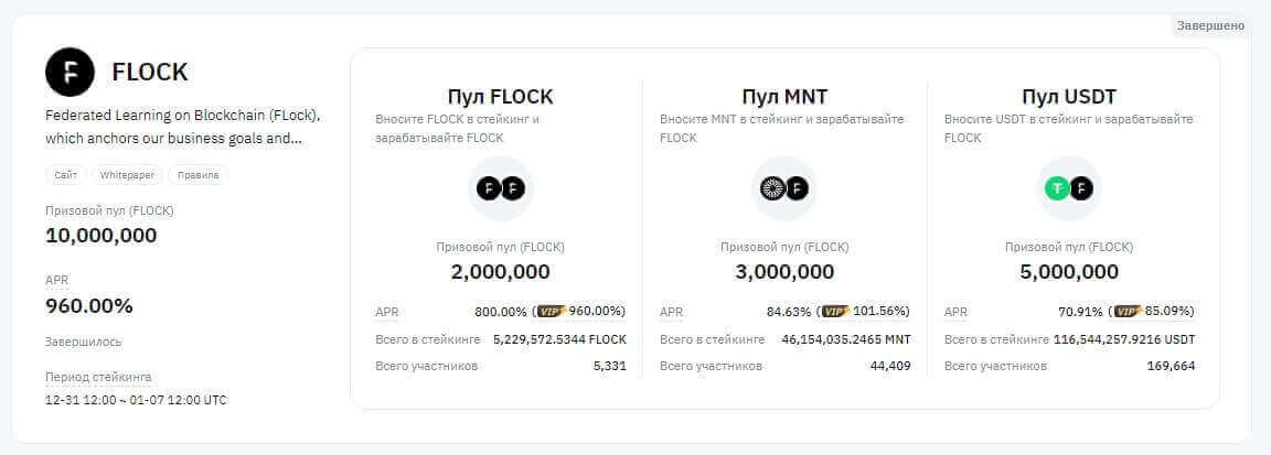 - Пул Flock. Доходность 800% (960% для VIP пользователей). В стейкинге участвовало 5 миллионов монет Flock с призовым фондом в 2 миллиона Flock, которые были разделены между 5 тысячами пользователями.