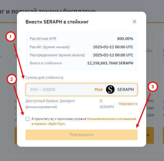 - Затем пользователь должен определить количество криптовалюты, которое они хотят вложить, соглашаются с правилами использования и производят стейкинг своих активов.