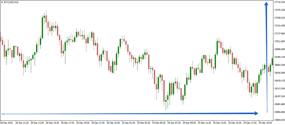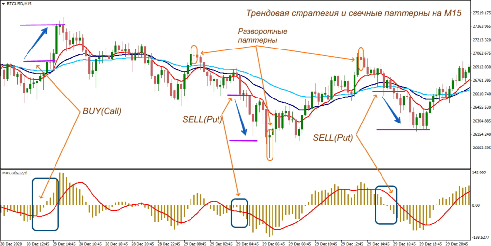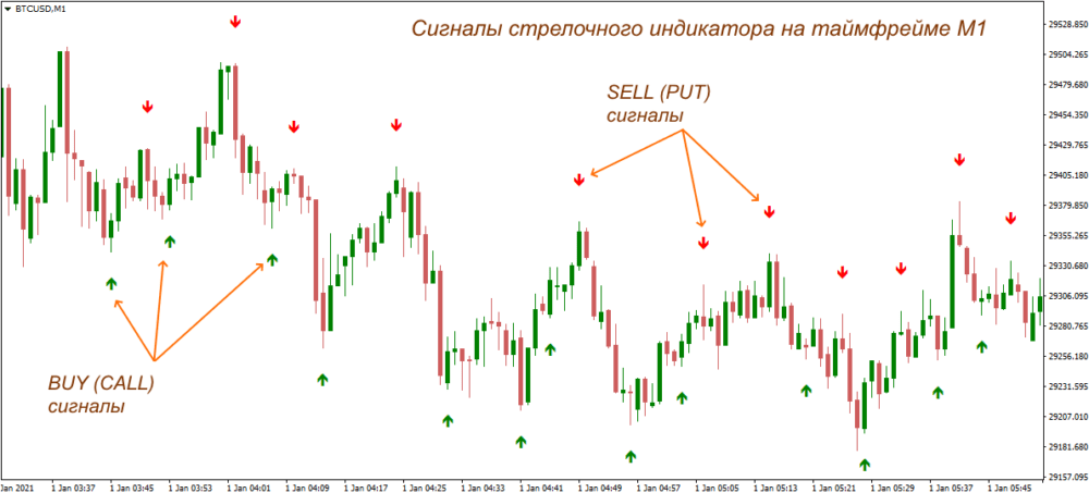 - M1. Самый короткий и «шумный» таймфрейм. Сделки открыты 2-3 минуты с профитом 5-7 пунктов. Если просматривать историю любой биржи криптовалют можно найти четкие тренды и паттерны, но реальный поток котировок не дает возможности спокойного анализа и большинство индикаторов работают по принципу «стрелочника» показывающего возможные точки входа/выхода.