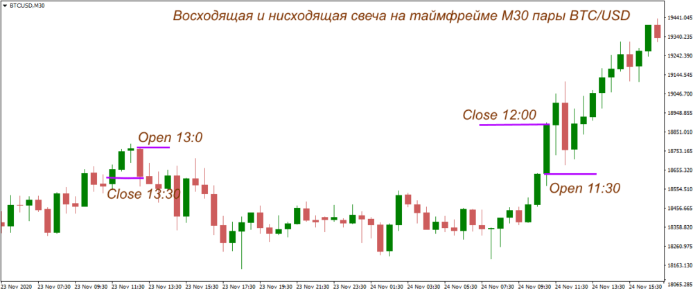 Теперь можно определиться с терминологией. Итак, таймфрейм (англ. timeframe) это временной период, за который формируется очередная свеча, ценовой бар, точка на линейном графике. Вот как это выглядит на 30-минутном таймфрейме пары BTC/USD (Биткоин/доллар США):