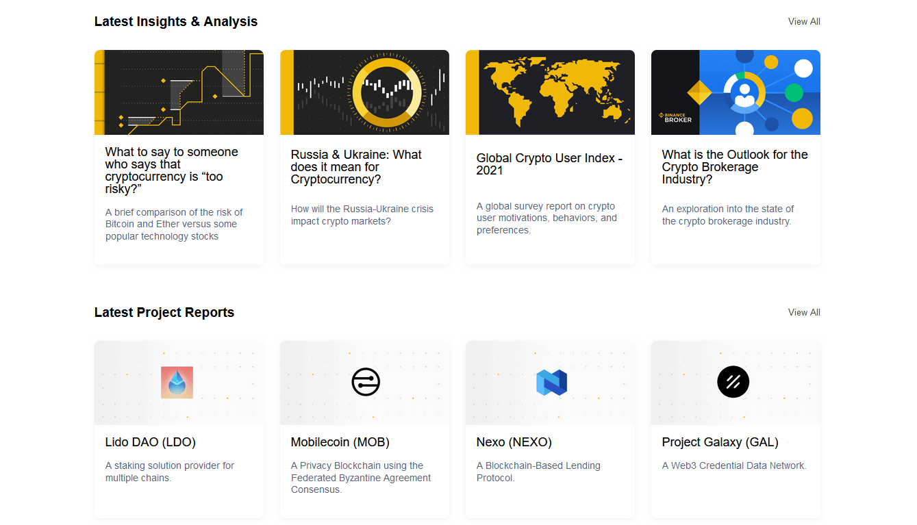 - Отчеты на портале Binance Research. Предлагают исчерпывающий набор исследователей множества представленных на бирже монет, а также глобальных факторов, влияющих на формирование курса. Единственное неудобство – сайт доступен только на английском языке. Однако здесь можно найти множество полезных статей, объясняющих причины, а главное следствия возникновения определенных геополитических решений, а также внимательно рассматривающих развитие определенных проектов и инфраструктурных решений.
