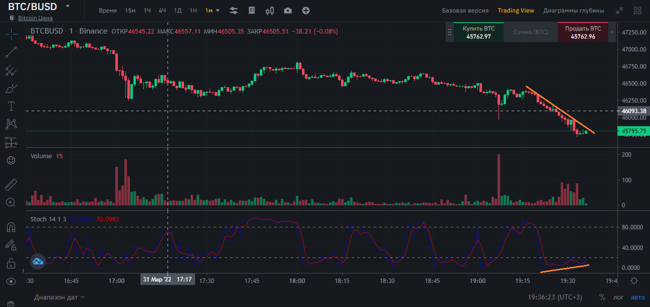 Одно из неоспоримых преимуществ идентификации конвергенций и дивергенцией в трейдинге – универсальность данного паттерна. Как было указано в определении выше, суть модели заключается в расхождении или схождении между собой двух трендовых линий. В первом случае такую прямую можно построить по любым экстремумам тренда – от тиковых до определенных таймфреймов на любых типах баров – японских, американских, Heiken Ashi. Главное требование – в качестве технического средства должен использоваться трендовый инструмент. Это логично исходит из того, что рассматриваемые схождения и расхождения могут выявляться только на четко обозначенных трендовых векторах. В «боковике» подобные модели если и появляются, то не несут никакой пользы, так как инструмент развивается в четко ограниченном диапазоне. Ниже представлен минутный график криптовалютной пары BTC/BUSD. Оранжевыми линиями выделены тренды на основном ценовом графике и стохастике. Стохастик показывает небольшой рост, в то время, как котировки уверенно падают, имеем схождение.