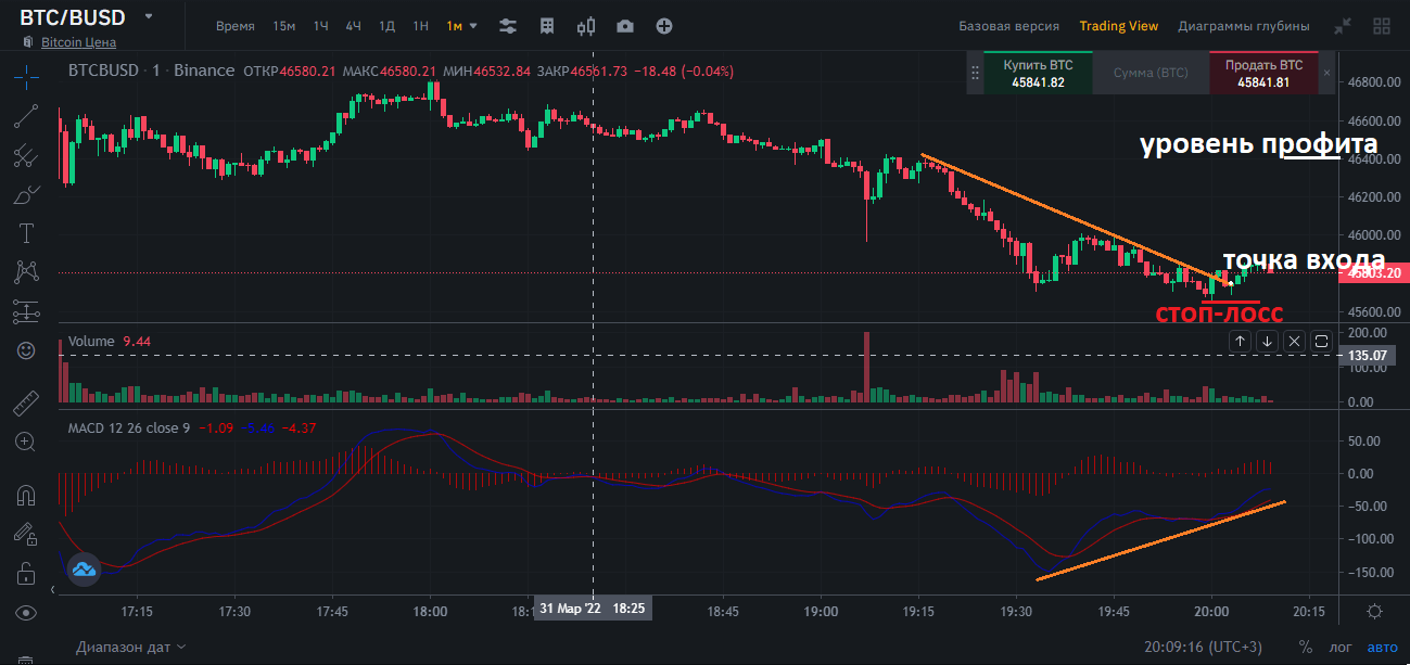 Ниже показан пример по рассмотренной ранее криптопаре на минутном интервале, но второй отрезок строится на индикаторе MACD (узнать все основные правила его функционирования можно из предлагаемой по ссылке статьи). Видим более выраженный вектор, что позволяет чисто графически идентифицировать скорую смену тенденции. Наиболее безрисковая точка входа – в момент пересечения трендовой границы. При этом установленный на предыдущем минимуме ордер ограничения потерь принесет не более 150 пунктов убытка, в то время как потенциальный профит находится в точке 46400, то есть на 600 пипсов выше потенциального открытия.