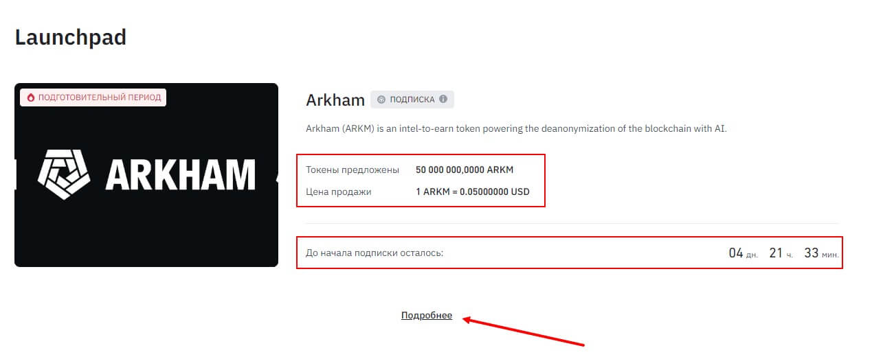 Появится список токенов для приобретения в формате подписки. Можно увидеть сколько предложено для покупки, время до начала подписки и цена продажи в соотношении 1 токен к сумме в $. Именно в долларах, не путайте с BNB, с помощью которых и покупаются токены. Чтобы посмотреть на прошлые IEO, нажмите на ссылку “Подробнее”.