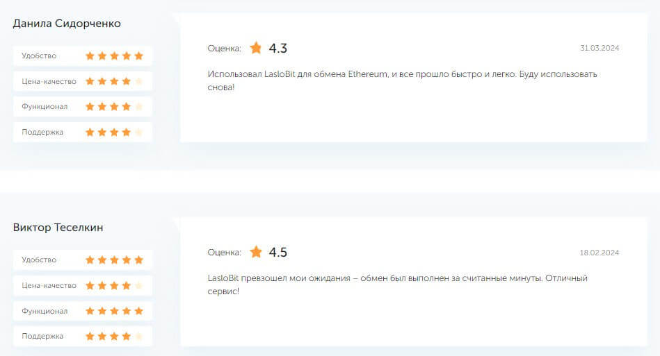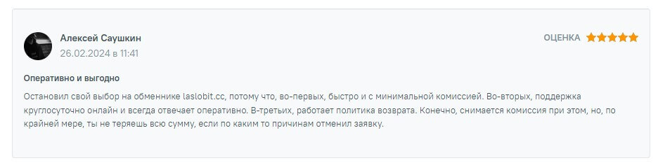Клиенты обменника Laslobit широко отзываются о своем опыте использования сервиса в положительном ключе. Все отзывы взяты исключительно из проверенных сервисов-отзовиков. Одним из наиболее часто упоминаемых преимуществ является высокая скорость обработки транзакций. Пользователи подчеркивают, что обмен валют происходит максимально быстро, что особенно ценно в условиях нестабильного курса криптовалют.