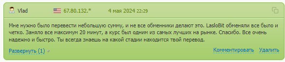 - Следует проверять отзывы других пользователей на различных платформах. Опыт других клиентов может предоставить важную информацию о надежности и эффективности работы Laslobit. Еще один важный момент — обращать внимание на то, как обменник решает возникающие проблемы и насколько оперативно отвечает на запросы пользователей.