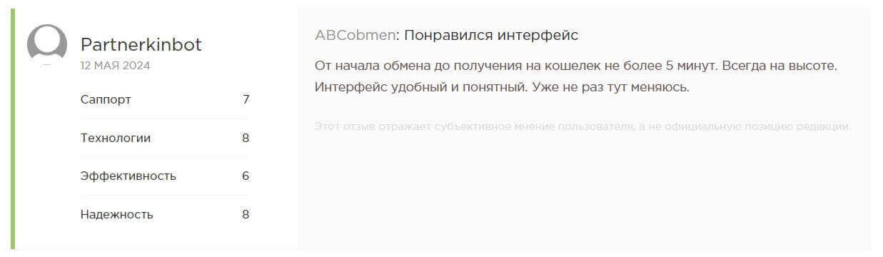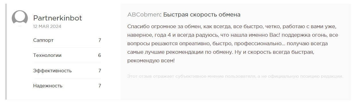 Abcobmen заслужил высокие оценки среди пользователей за свою надёжность, оперативность и выгодные условия обмена.