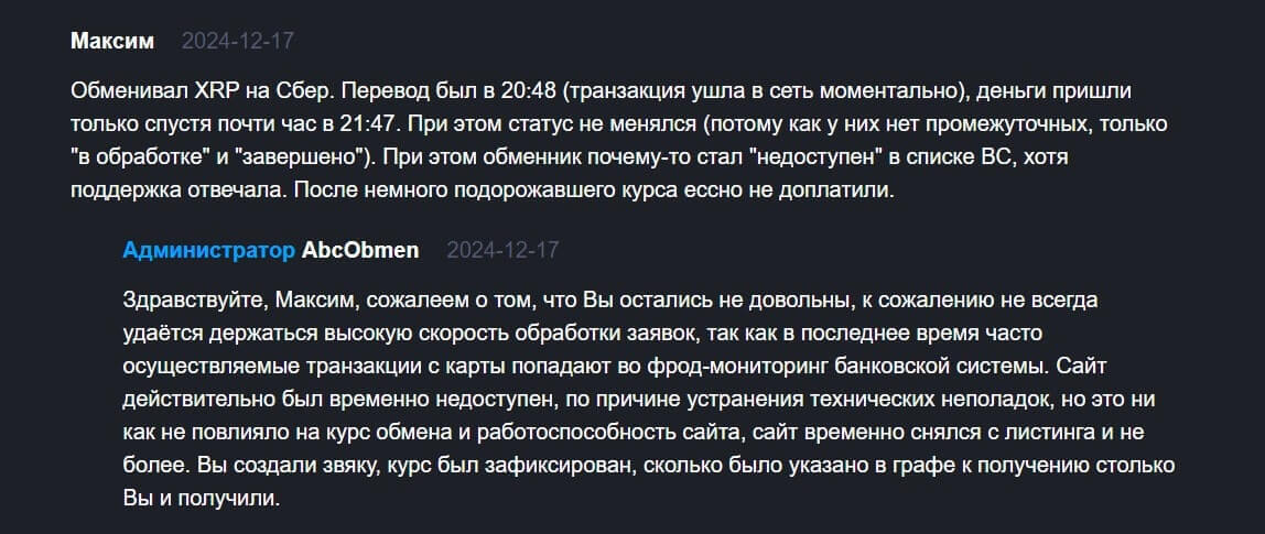 Кроме того, положительные отзывы часто касаются справедливых курсов обмена, что делает Abcobmen одним из наиболее выгодных вариантов на рынке. В сочетании со всеми вышеперечисленными преимуществами, таким подходом обменник заслужил уважение и лояльность большого числа клиентов.