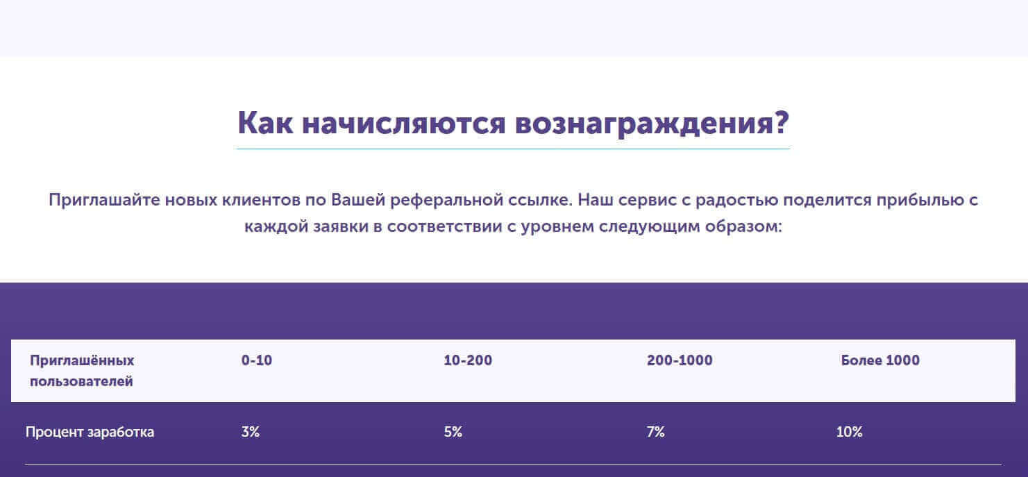 Сервис предлагает заработок на обмене валют других пользователей. Доход зависит от количества пользователей и составляет от 3 до 10% от дохода обменника (максимальный процент доступен при приглашении от 1000 пользователей). Чтобы получить его, нужно пройти регистрацию на сайте, войти в личный кабинет и получить ссылку, которую можно опубликовать там, где необходимо или переслать друзьям.