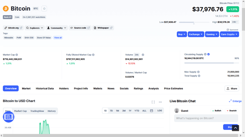- Market Cap. Составляет $719440 288, 831, который получился путем умножения значения Circulating Supply (циркулирующего) в 18 944 415BTC на $37976.76 за базовую единицу.
