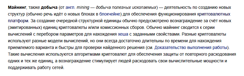 Так как криптовалюты не имеют эмиссионного центра, который добавляет новые денежные знаки в платежную систему по мере необходимости, это делают независимые участники или «майнеры». Желающие заняться этим процессом могут легко найти информацию в Интернет, а если говорить проще, необходимо найти новый уникальный хеш или ключ, которым помечается блок, содержащий набор транзакций. Транзакции в обязательном порядке подтверждаются другими узлами и только после этого добавляются в блокчейн. Посмотрим, что об этом говорит обычная Википедия: