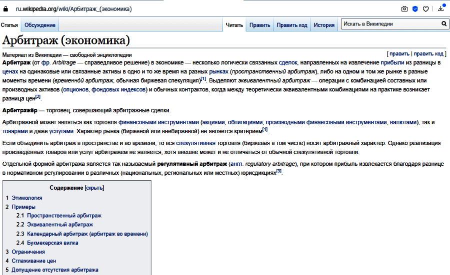 Арбитражная торговля — это вариант биржевой торговли, направленный на получение прибыли от разницы цены актива на разных торговых площадках. На начальной стадии развития криптобирж подобный подход был хорошим выбором. Отсутствие механизмов обмена ликвидностью, как это делается на фондовом и валютном рынках, давало возможность устанавливать котировки, отличающиеся на десятки долларов за монету. Таким образом, спекулянты получали доход просто от операций купли/продажи, независимо от направления рынка. Сейчас котировки выровнялись, если и возможен арбитраж, то только на крупных депозитах и с использованием автоматических систем HFT-трейдинга – иначе не получится вовремя увидеть возможность и быстро войти в рынок. Подробнее о видах арбитражной торговли читайте в Википедии, но не все формы арбитража применимы в криптовалютных операциях.