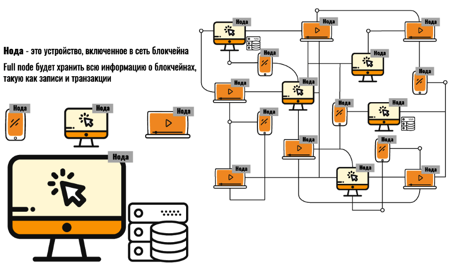 Нода — простыми словами, это настольный компьютер или мобильное устройство, на котором запущено программное обеспечение доступа в криптовалютную сеть. Нода обеспечивает три основные задачи: подтверждение транзакций (следование консенсусу), передача информации по сети (обновление балансов кошельков и т.д.), хранение полной или частичной копии истории транзакций (блокчейн).