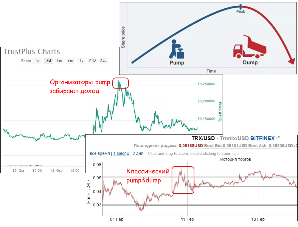 Классическая биржевая спекуляция: владельцы большого количества торгового актива, в нашем случае криптовалюты, начинают поднимать цену с помощью информационного ажиотажа через СМИ, сайты и каналы мессенджеров таких как Telegram. Когда большинство мелких игроков играют на повышение, на пике цены организаторы продают монеты, забирая прибыль, и котировка резко падает. Подобные схемы чаще всего встречаются на валютах с премайнингом, когда все монеты выпущены заранее, но может быть и памп майнинг, при котором быстро генерируется и в определенное время вбрасывается на рынок большое количество криптовалюты. Примеры pump&dump:
