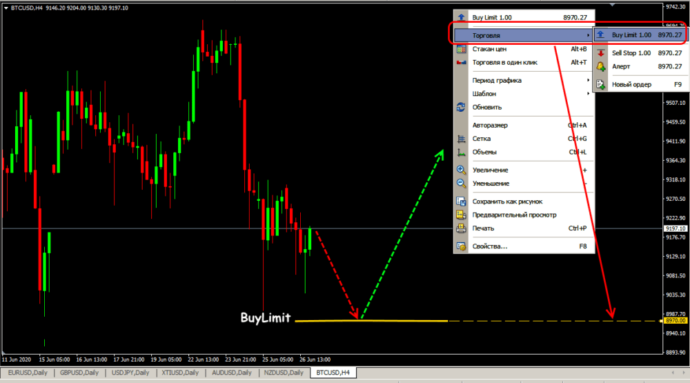 На биржевом сленге означает установку отложенного разворотного ордера на покупку типа BuyLimit. Размещается ниже текущей цены − трейдер предполагает, что после падения рынка до указаного уровня («ведро» заполнилось), восходящий тренд возобновится, и ордер на покупку автоматически откроется. Размещается ниже текущей рыночной цены.