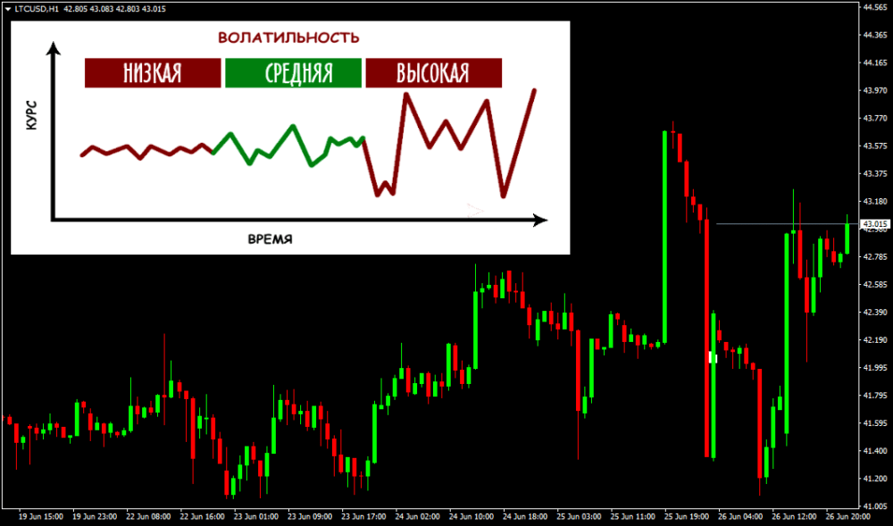 Волатильность — это диапазон изменения цены финансового актива за определенный временной промежуток (день, неделя, месяц). Применительно к трейдингу это означает, сколько пунктов (а не денег!) прошла котировка за указанный период. Волатильность бывает: