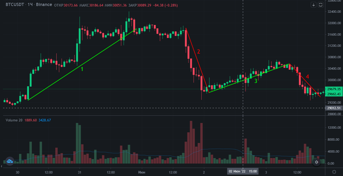 Система работает преимущественно в направлении устоявшегося тренда, поэтому идентификация будущего направления, выявленная сразу на нескольких индикаторах, дает высокую степень достоверности, достаточную для входа в рынок. Ниже показан актуальный на момент написания материала часовой график BTC/USDT, на котором за 4 торговых дня с 30 мая по 02 июня 2022 года было выявлено сразу четыре локальных тренда, два на понижение и столько же в рост. Благодаря исключению фактора высокой волатильности на свечах с часовым периодом, трейдер при должном подходе к анализу может выявлять прибыльные точки для входа в рынок с точки зрения соотношения принимаемого риска к потенциальной прибыли.