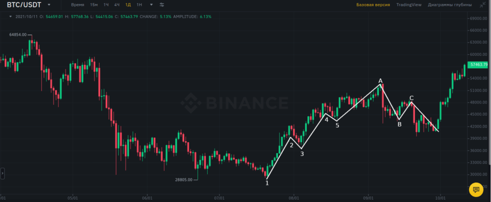 Автор предполагал лишь две фазы, в которых биржевой актив может находиться в глобальном смысле слова — рост (медвежья фаза) и падение (период медведей). В пределах одного тренда предлагается идентифицировать пять всплесков в главенствующем направлении и три коррекции. При этом первая 5-ступенчатая структура является главенствующей, а последние три ступени — вспомогательными. Причем дополнительная функция крайних трех участков проявляется в пределах рассматриваемой самостоятельно тенденции, для последующего развития событий эти же составляющие могут войти в новые 5 всплесков. Ниже показан рисунок рассматриваемой доктрины на примере пары BTC/USDT у брокера Binance.