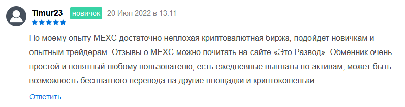 В этом материале будут показаны полученные криптобиржей MEXC отзывы реальных людей. Эта площадка не является популярным местом для торговли. Потому понять, развод или нет работа здесь с биржевыми активами, помогут только мнения тех, кто уже успел воспользоваться ее услугами. Все приведенные отзывы клиентов о бирже взяты из открытых источников, форумов и других специализированных ресурсов, что гарантирует отсутствие недостоверной и откровенно заказной информации.
