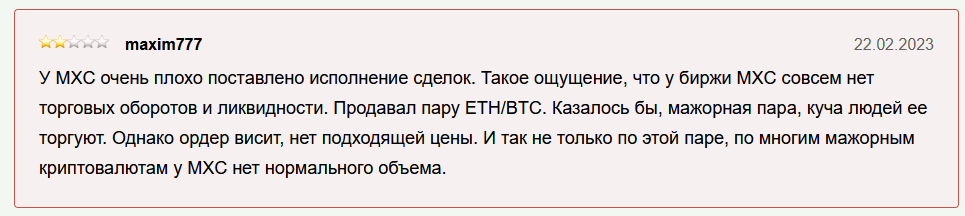 О проблемах с исполнением поручений на фоне недостаточной ликвидности можно узнать из отзыва другого клиента. Он торговал одной из самых маржинальных пар – ETH/BTC. Однако ордер продолжительное время оставался в рынке, что говорит о том, что предложение может оставаться неудовлетворенным долгий период времени. Это делает неактуальными активные внутридневные стратегии, а также высокочастотную и алгоритмическую торговлю, где часто критически важно точное исполнение заявки в короткий промежуток времени после входа в рынок.