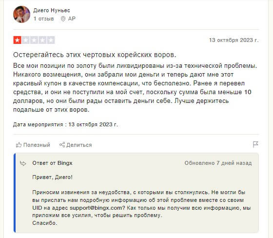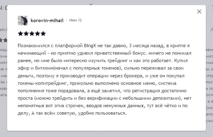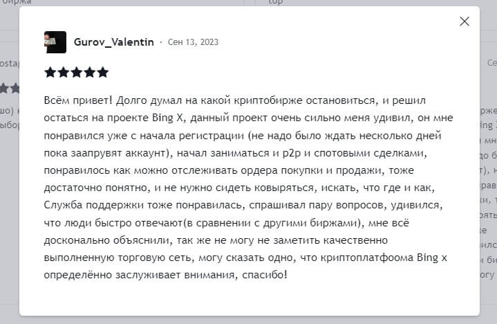 Первый отзыв, рассматриваемый в нашем критическом обзоре о торговой платформе BingX от пользователя, поставивший торговой площадке 5 звезд, рассказав о том, что сайт понравился с самого начала (от регистрации), до проведения спотовых сделок и P2P торговле. Также рассказал об отзывчивости и скорости обработки запроса технической поддержкой.