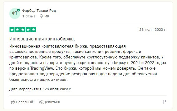 Следующий отзыв оказался положительным от подтвержденного системой пользователя, который рассказал о том, что биржа считается инновационной, предлагающей множество услуг, в т.ч. копитрейдинг, форекс и криптовалюта. Также он рассказал и о том, что компания поддерживает круглосуточную поддержку клиентов и уверяет всех, что бирже можно доверять свои средства.