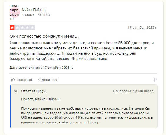 В первом отзыве нас встречает негативное мнение на 1 звезду от клиента из США Майкла Пайрона, говоря о краже 25 000 долларов, которые по его словам не дают вывести администраторы проекта. Также рассказал о сложности подачи иска в суд, так как базируются в Китае. В ответ компания ответила, что следует написать технической поддержке на почту.