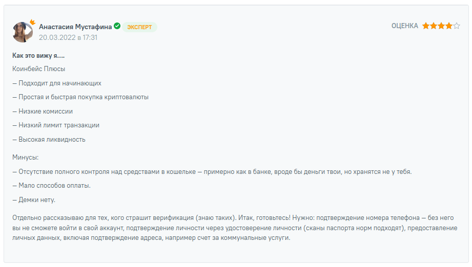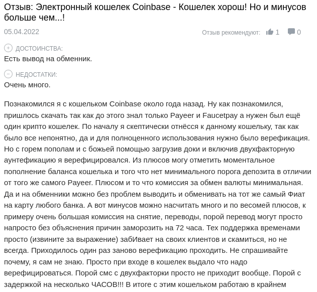 Трейдер пришел на рассматриваемую площадку, когда искал удобный сервис для распоряжения критовалютными активами, в итоге выбор пал на Коинбейс. Из основных плюсов он называет оперативное зачисление токенов после пополнения кошелька и низкие комиссионные сборы при обмене. А вот в списке недостатков гораздо больше пунктов — в его отзыве о выводе средств приведена информация о высокой комиссии за их снятие с депозита, длительный период поступления переводов, а также неоднозначное поведение платформы при проверке клиентских транзакций, из-за чего может возникнуть необходимость в повторной верификации. Все это не позволяет использовать платформу в качестве единственного источника проведения обменных транзакций, а прибегать к ее услугам только при появлении крайне выгодных предложений, ради которых можно потратить несколько дней в ожидании перевода.