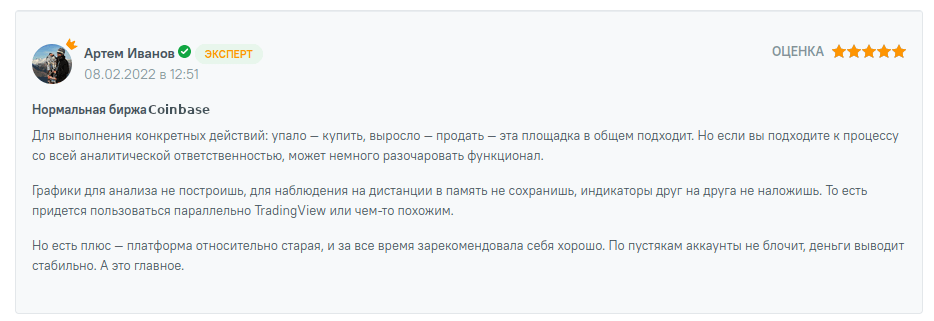 Рассмотренные выше отзывы реальных людей не позволяют рекомендовать биржу Coinbase в качестве площадки для занятия криптовалютным трейдингом. Многочисленные запреты и трудности с проведением финансовых операций сделают работу здесь для российских трейдеров крайне сложной. Если же требуется простая система покупки и продажи токенов, а вопрос санкций для конкретного биржевика не актуален, платформу можно использовать для работы. Подытоживая, именно санкции и прекращение полноценного обслуживания пользователей из РФ можно назвать главной проблемой биржи на текущий момент.