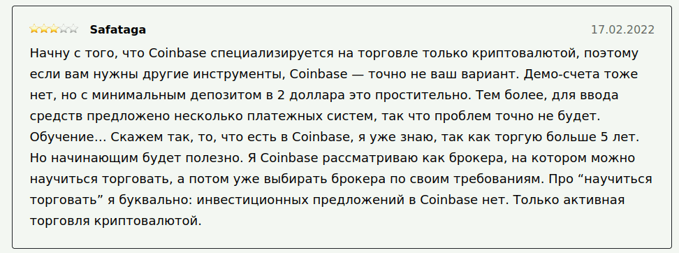В этой статье разберем имеющиеся отзывы о Coinbase, одной из популярных биржевых площадок и узнаем мнение о компании частных клиентов из России и других стран мира. Все рассмотренные далее свежие отзывы взяты с авторитетных специализированных ресурсов и форумов, успешно прошли модерацию и отражают реальное положение дел на данной бирже.
