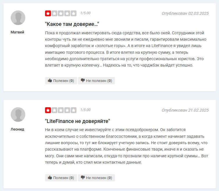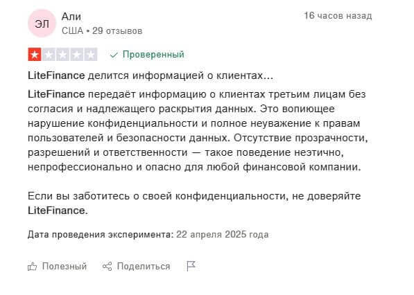 В сети можно найти негативные отзывы клиентов о брокере LiteFinance, которые в основном касаются сложностей с выводом средств, нестабильности торговой платформы и обвинений в недобросовестности со стороны управления компании. Одной из главных причин недоумения пользователей считается передача данных третьим лицам, что негативно складывается на жизни пользователей.