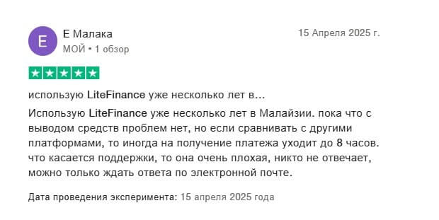 LiteFinance, ранее известный как LiteForex, получает множество положительных отзывов от своих клиентов, что говорит о его стабильной репутации на рынке. Удовлетворенные пользователи часто отмечают высокое качество обслуживания и клиентоориентированность компании.