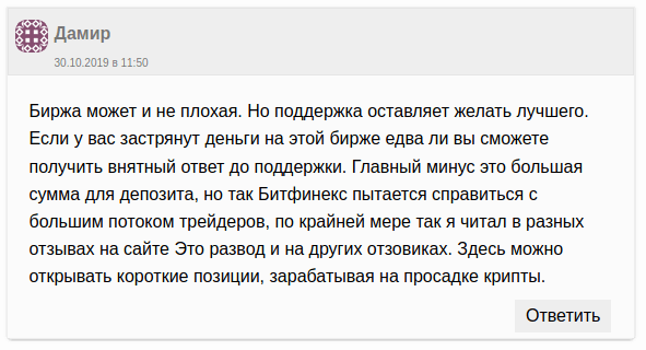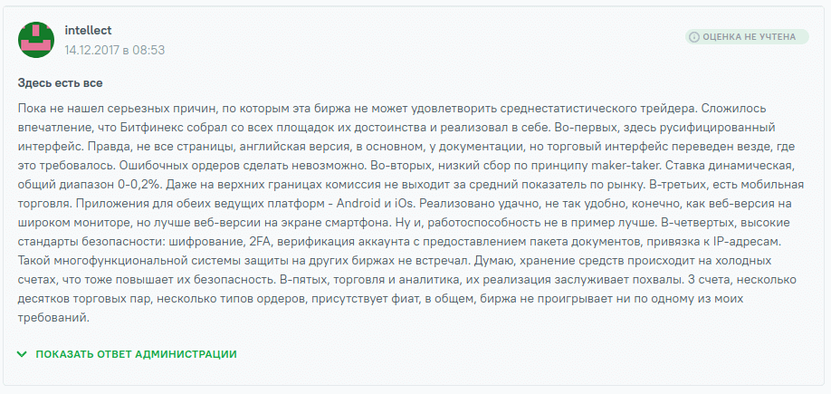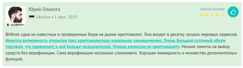 Как правильно отмечает клиент, среди бесчисленного множества откровенно мошеннических платформ Битфинекс выгодно выделяется как надежный поставщик биржевых услуг.