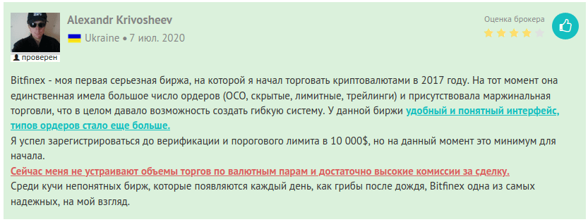 В следующем фидбеке трейдер отмечает, что успешно торгует здесь уже несколько лет. Ценится им разнообразие торговых ордеров и отдельно отмечается преимущество в ранней регистрации, благодаря чему удалось избежать повышенных требований по минимальному уровню депозита. Действительно, начальный капитал в $10 000, который требуется в настоящее время, может быть доступен далеко не всем игрокам, особенно начинающим. И это едва ли не единственный недостаток Битфайнекс.