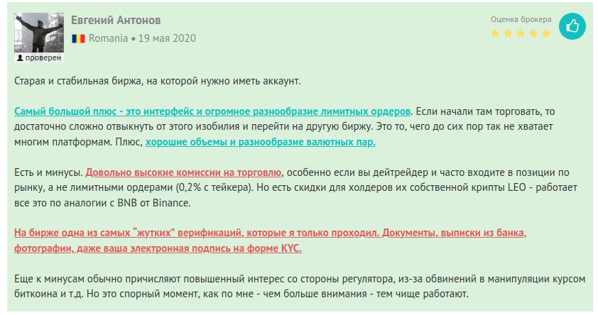 Здесь указывается на огромный выбор типов ордеров на управление активной позицией, большая волатильность и отличный выбор валютных пар для трейдинга. Одним из недостатков приводится высокий, по мнению игрока, уровень комиссии. Однако для тех, на чьем счету присутствует сумма в $10 000 и более, комиссию в 0,2% (максимальный уровень здесь) просто не заметят. Автор говорит о верификации в отрицательном ключе — он отмечает сложный процесс подтверждения личности. Тут можно отметить, что это едва ли не единственная биржа, способная со всей уверенностью утверждать, что хорошо знает собственных клиентов и на все сто выполняет требования регуляторов.