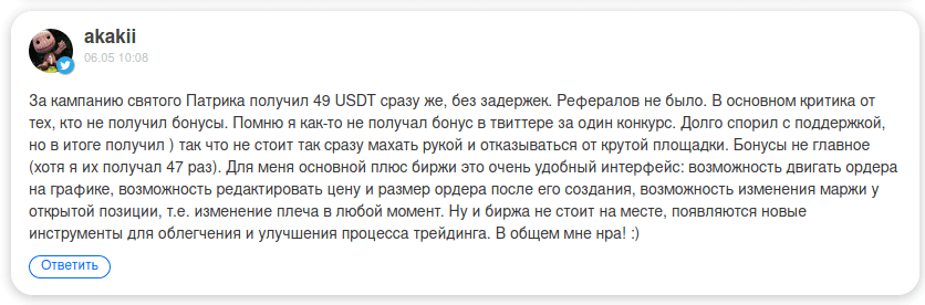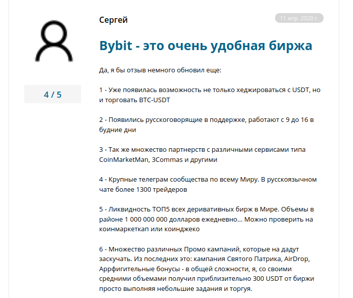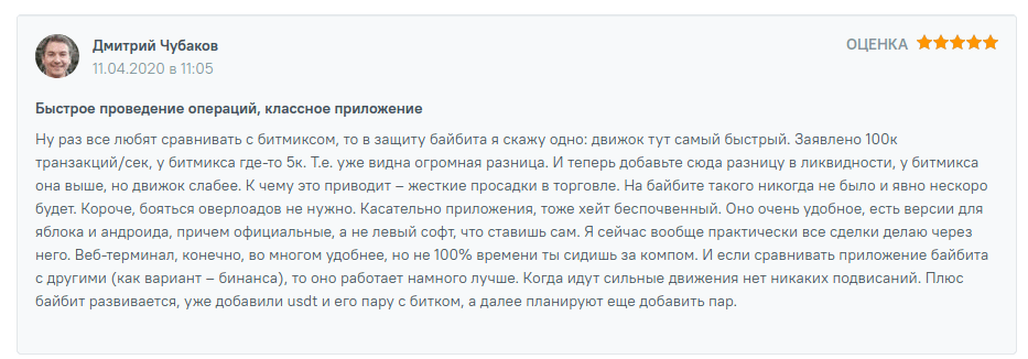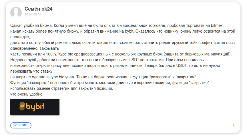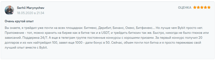 Особо ценны отзывы c форумов о торговле тех, кто успел попробовать свои силы на других площадках. Примечательно, что такие трейдеры тоже оставляют положительные отзывы о ByBit. Автор утверждает, что ни разу не видел зависаний в торговле или ошибок терминала. Высоко ценятся конкурсы лояльности с ценными призами. Отзыв на пять звезд — это о Bybit.