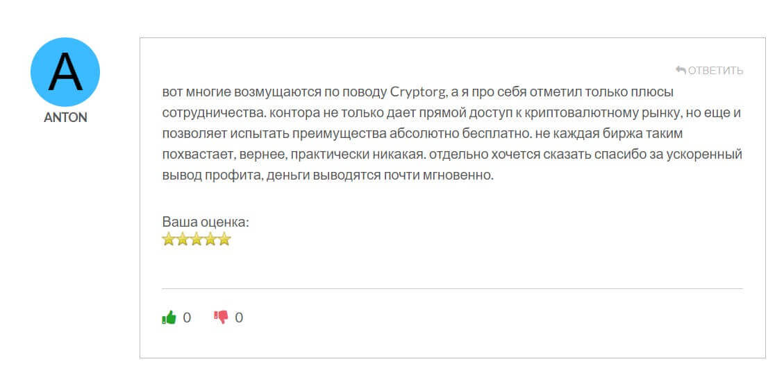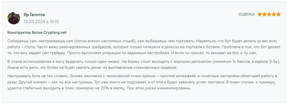 Сообщество биржи активно развивается, и на платформе часто появляются обновления и новые функции, что говорит о направленности биржи на улучшение пользовательского опыта. Давайте узнаем же о том, что думают пользователи о данной бирже с торговыми ботами. Мы собрали отзывы о Cryptorg от пользователей из специализированных форумов.