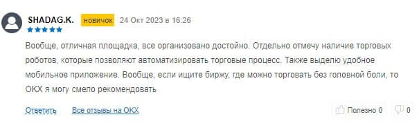 Благодаря своей производительности и надежности, OKX привлекла большое количество пользователей, которые активно делятся своим мнением в сети. Отзывы о криптобирже варьируются от восторженных комментариев о быстроте транзакций и поддержке клиентов до критических замечаний о сложности некоторых функций для новичков. В целом, большинство пользователей выражают удовлетворение предоставляемыми услугами и рекомендуют OKX как надежную платформу для криптотрейдинга.