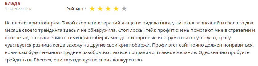 Фидбек, полученный непосредственно от трейдеров, успевших воспользоваться услугами биржи криптовалют — лучший источник информации о том, как обстоят дела с качеством сервиса и уровнем предлагаемых услуг. Особенно это важно, когда сама компания декларирует значительные отличия в качестве своей работы от конкурентов. Есть подобные возможности и у Phemex, которая предлагает владельцам торговых аккаунтов самую высокую скорость выполнения поручений. Это открывает отличные возможности для заработка не только биржевым игрокам, использующим высокопроизводительные автоматизированные системы со скальперским уклоном, но и простым трейдерам — оперативное заключение сделки поможет нивелировать фактор проскальзывания и гарантированно войти в рынок по желаемому курсу. Представленные сведения о бирже, предлагающей минимальную задержку с выполнением ордеров, подтверждает владелец личного кабинета на данной площадке.