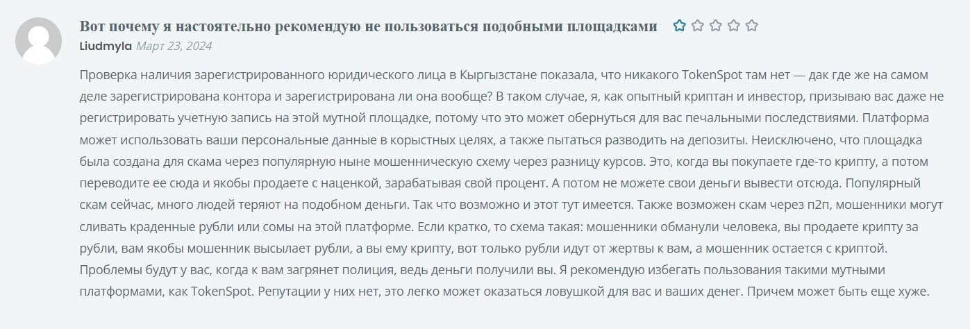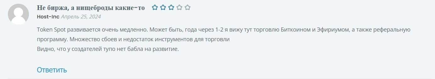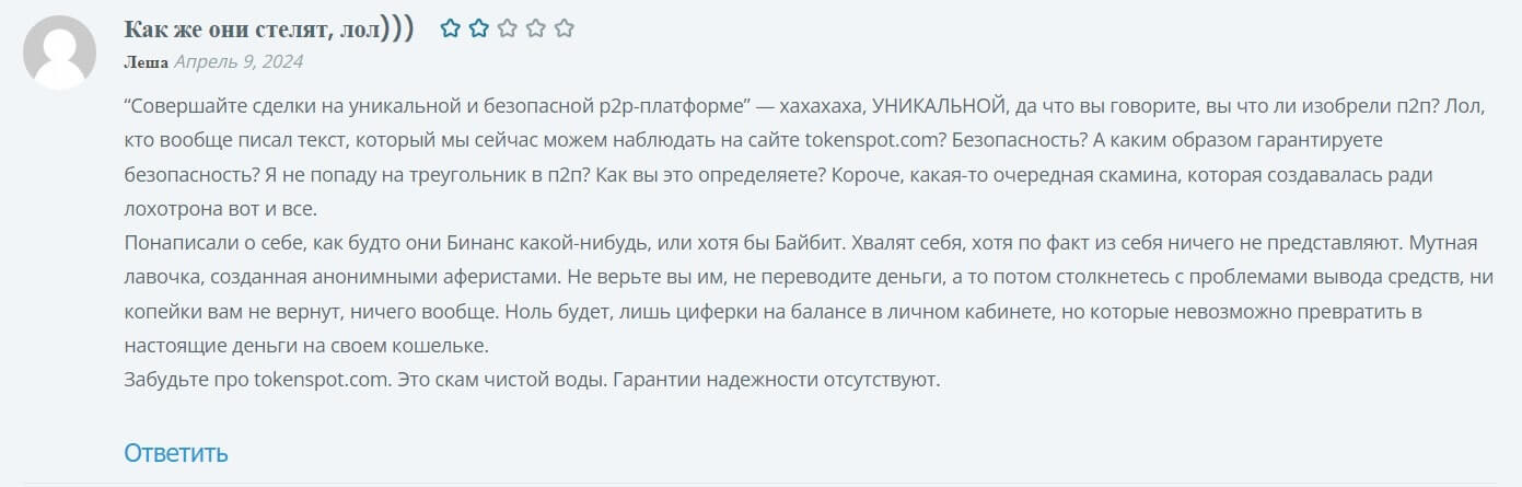 Есть немало участников сообщества, которые идут дальше в своей критике, утверждая, что Tokenspot действует как скам. Эти обвинения часто основываются на слухах о заморозке аккаунтов без видимых на то причин, а также об ощутимых задержках в отзывах о выводе средств на кошелек, что, по мнению пользователей, свидетельствует о ненадежности платформы.