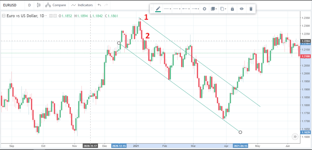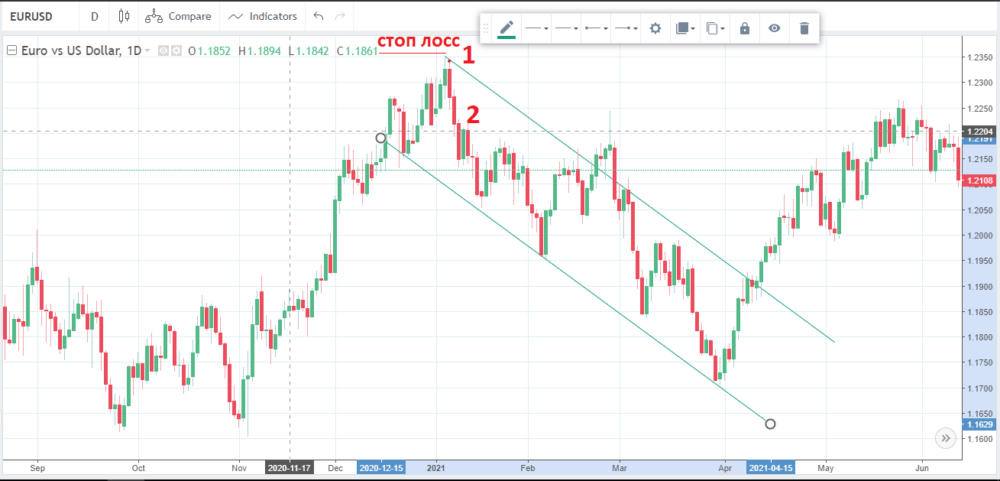 Основная задача трейдера – выбирать такие позиции, в которых соотношение потенциальной прибыли к возможным потерям будет минимальным. Для наглядного примера обратимся к реальному графику евро/доллара на рынке форекс, чтобы понять, как составить план и как рассчитать все показатели корректно. Идентифицировав краткосрочный канал, биржевой игрок принимает решение торговать внутри него. В точке 1 на графике при входе в короткую позицию имеем минимальную опасность развития тренда в обратном направлении (защитный уровень отстает от точки входа всего на несколько пунктов) и высокий потенциал.