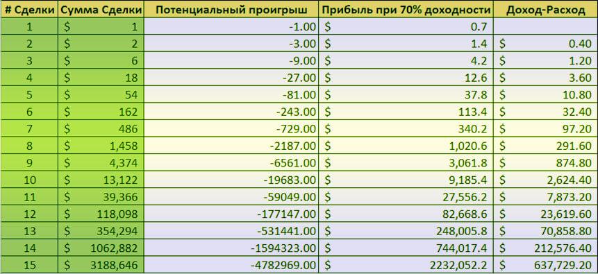 В случае с Мартингейлом предполагается, что при получении убытка последующий ордер увеличивается в объеме кратно потерям. Например, бинарный опцион в 1$ был закрыт не в пользу клиента. На счету образовались потери объемом в один доллар. Значит следующая позиция должна открываться в двукратном увеличении. Тогда при получении прибыли в виде процентов от опциона и возврате вложенных средств перекрывается предыдущая потеря и получается профит.