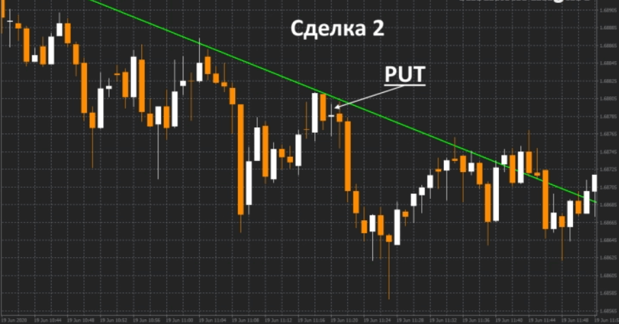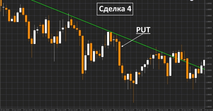 Как вы можете понять, в нашем примере тренд был нисходящим, поэтому необходимо было приобретать опцион “Put”, чтобы сделка смогла принести нам прибыль. С учетом начальной суммы сделки в 3$, нам удалось получить небольшую прибыль в размере 2,25$ (75%). А теперь нужно нам увеличить торговый объем еще в 2 раза (то есть поставить 6$) на опцион “Put”.