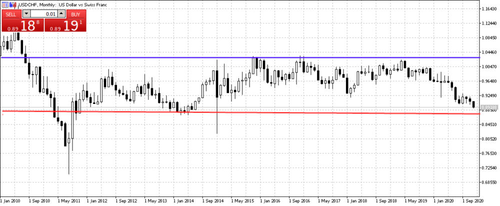 Поясним на конкретном примере. Ниже изображен график американского доллара к швейцарскому франку с периодом в месяц. Даже беглый анализ позволяет увидеть, что котировки в настоящее время находятся около уровня поддержки (красная линия на графике, уровень 0,88126) с перспективой роста до максимума последних лет — 1,02964 (синяя линия) и выше. В условиях установки защиты ниже уровня поддержки на «круглой» цифре 0,8700, возможность роста составляет 148 пунктов к 12 пунктам риска по стоп-лоссу. Соотношение очень привлекательное. И таких возможностей на любом рынке всегда можно найти великое множество.
